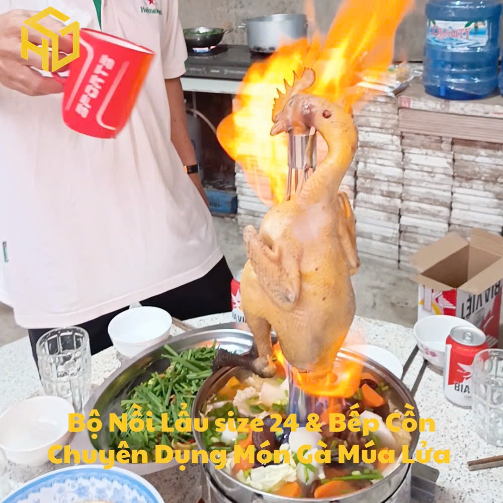 Bộ nồi lẩu gà múa lửa kết hợp bếp cồn chuyên dụng là sự lựa chọn hoàn hảo cho các nhà hàng và quán ăn phục vụ món lẩu đặc sắc "Chicken Dance Flame". Sản phẩm được thiết kế từ thép không gỉ cao cấp, đảm bảo độ bền và an toàn vệ sinh thực phẩm. Với kích thước 24cm, nồi lẩu được trang bị giá treo gà chuyên dụng, giúp dễ dàng thực hiện kỹ thuật sối rượu mai quế lộ, tạo nên ngọn lửa ấn tượng, mang lại trải nghiệm thị giác độc đáo cho thực khách.