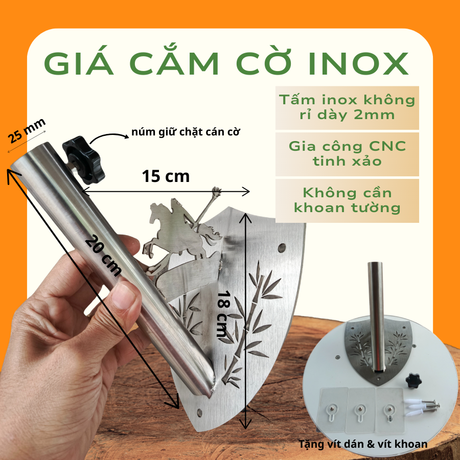Với chất liệu inox không gỉ cao cấp, độ dày mặt inox lên đến 2mm, giá cắm cờ đảm bảo độ cứng cáp vượt trội, không cong vênh, không oxy hóa khi sử dụng ngoài trời. Sản phẩm phù hợp cho cả sử dụng ngắn hạn trong dịp lễ và sử dụng lâu dài quanh năm.